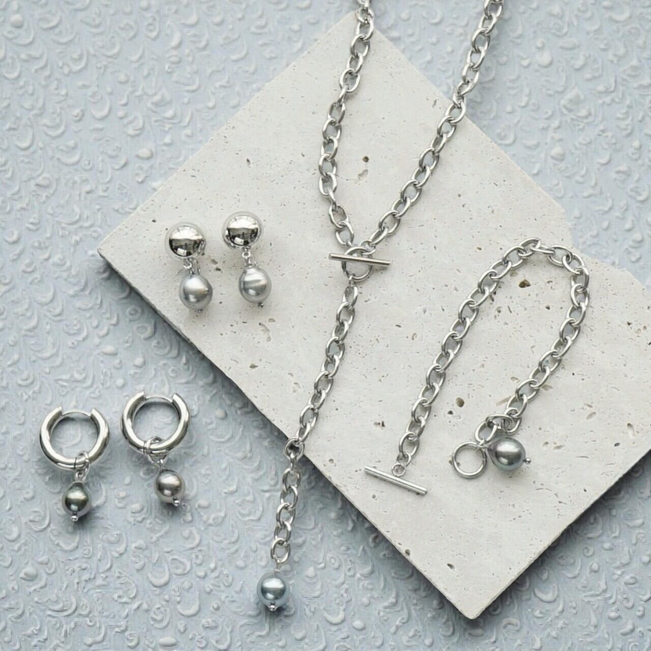 タヒチパールの奥深い輝きと、ステンレスのスタイリッシュな質感が融合し、上品でモダンな印象を演出します。